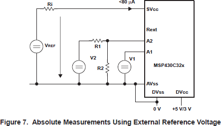 As Figure 7 shows, absolute measurements measure voltages and currents. The reference used for the conversion is the voltage applied to the SVcc terminal, regardless of whether an external reference is used or if SVcc is connected to AVcc internally. An external reference is necessary if the supply voltage AVcc (the normal reference) cannot be used for reference purposes, for example a battery supply.