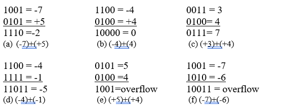The first four examples illustrate successful operation if the result of the operation is +ve then we get +ve number in ordinary binary notation. If the result of the operation is –ve we get negative number in twos complement form. Note that in some instants there is carry bit beyond the end of what which is ignored. On any addition the result may larger then can be held in word size being use. This condition is called over flow. When overflow occur ALU must signal this fact so that no attempt is made to use the result. To detect overflow the following rule observed. If two numbers are added, and they are both +ve or both –ve; then overflow occurs if and only if the result has the opposite sign.