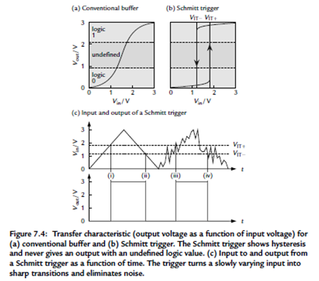 The voltage on inputs should therefore pass rapidly through the transition zone. This is particularly important for inputs that generate interrupts or provide clocks (to a timer, for instance). An excellent feature of the MSP430 is that its inputs are provided with Schmitt triggers, which eliminate many of these problems. This includes the standard port inputs, which also protects their interrupts. Other digital inputs, such as the external clock to the timer, also pass through the Schmitt triggers. The details are shown in Port pin schematics in the data sheets. Figure 7.4 shows the output voltage as a function of the input voltage for a conventional buffer and a Schmitt trigger. The major difference is that a Schmitt trigger displays hysteresis. This is most easily explained by looking at the response to a slow triangular, wave on the input in Figure 7.4(c).The input and output are initially at 0 voltage and the input voltage rises gradually. The output remains safely in the range for logical 0 until the input passes through the upper