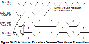 If two or more master transmitters simultaneously start a transmission on the bus, an arbitration procedure is invoked. Figure 38-15 shows the arbitration procedure between two devices.