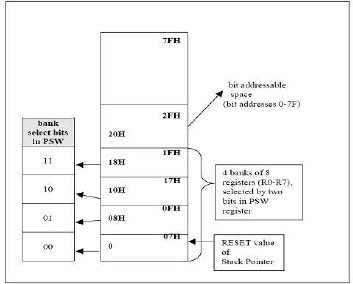 - Internal Data Memory contains four banks of eight registers and a special 32- byte long segment which is bit addressable by 8051 bit-instructions