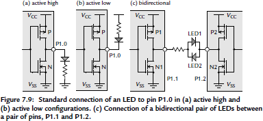 The standard circuits for connecting an LED to a pin of a microcontroller are shown in Figure 4.3 and are repeated in Figure 7.9, which includes the transistors inside the MSP430. Always include current-limiting resistors in series with the LEDs. Remember also that LED stands for light-emitting diode and that a diode passes current in only one direction, shown by the arrow in the symbol. This refers to conventional current, which flows from positive to negative. No light is produced if the LED is connected backward.