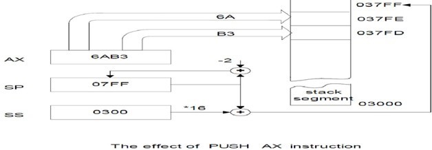Push to stack; this instruction pushes the contents of the specified register/memory location onto the stack. The stack pointer is decremented by 2, after each execution of the instruction. The actual current stack-top is always occupied by the previously pushed data. Hence, the push operation decrements SP by two and then stores the two-byte contents of the operand onto the stack. The higher byte is pushed first and then the lower byte. Thus out of the two decremented stack addresses, the higher byte occupies the higher address and the lower byte occupies the lower address.