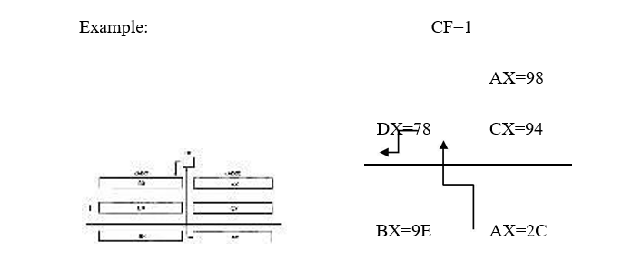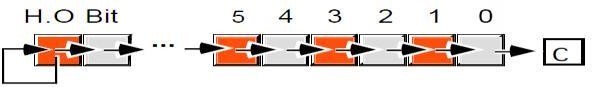 RCL: The rcl(rotate through carry left), as its name implies, rotates bits to the left, through the carry flag, and back into bit zero on the right. The rcl instruction sets the flag bits as follows: