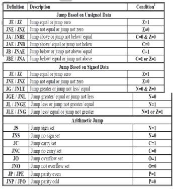 Conditional Jump: The conditional jump instructions are the basic tool for creating loops and other conditionally executable statements like if…..then statement. The conditional jumps test one or more bits in the status register to see if they match some particular pattern. If the pattern matches, the control transfers to the target location. If the condition fails, the CPU ignores the conditional jump and execution continues with the next instruction. Some instructions, for example, test the conditions of the sign, carry, overflow, and zero flags.