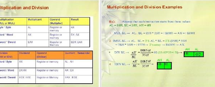 Arithmetic instructions: These instructions usually perform the arithmetic operations, like addition, subtraction, multiplication, and division along with the respective ASCII and decimal adjust instructions. The increment and decrement operations also belong to this type of instruction.