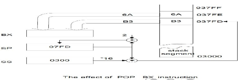 POP: Pop from Stack this instruction when executed loads the specified register/memory location with the contents of the memory location of which the address is formed using the current stack segment and stack pointer as usual. The stack pointer is incremented by 2. The POP instruction serves exactly the opposite of the PUSH instruction.