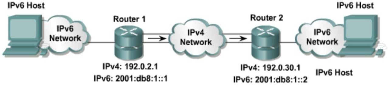 With manually configured IPv6 tunnels, an IPv6 address is configured on a tunnel interface, and manually configured IPv4 addresses are assigned to the tunnel source and the tunnel destination. The host or router at each end of a configured tunnel must support both the IPv4 and IPv6 protocol stacks.