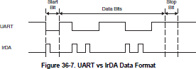 IrDA EncodingThe encoder sends a pulse for every zero bit in the transmit bitstream coming from the UART (see Figure 36-7). The pulse duration is defined by UCIRTXPLx bits specifying the number of one-half clock periods of the clock selected by UCIRTXCLK.
