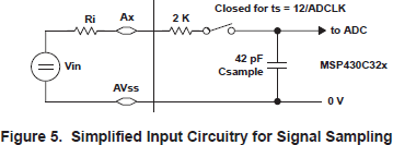The sampling of the ADC input takes 12 ADCLK cycles; this means the sampling gate is open during this time (12 s at1 MHz). The sampling time is identical for the range decision sample and the data conversion sample. The input circuitry of an ADC input pin, Ax, can be seen simplified as an RC low pass filter during the sampling period (12/ADCLK): 2 k in series with 42 pF. The 42-pF capacitor (the sample-and-hold capacitor) must be charged during the 12 ADCLK cycles to (nearly) the final voltage value to be measured, or to within 2–14 of this value.