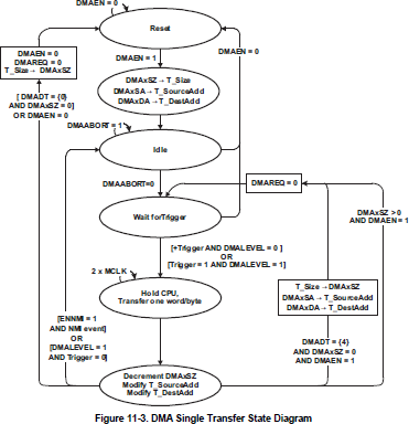 In single transfer mode, each byte/word transfer requires a separate trigger. The single transfer state diagram is shown in Figure 11-3.