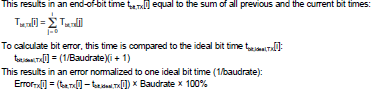 The timing for each character is the sum of the individual bit timings. Using the modulation features of the baud-rate generator reduces the cumulative bit error. The individual bit error can be calculated using the following steps.
