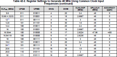 DVM represents the value of the UPMB field Table 42-2 lists some common clock input frequencies for CLKSEL, along with the appropriate registry settings for generating the nominal 48-MHz clock required by the USB serial engine. For crystal operation, a 4 MHz or higher crystal is required. For the crystal bypass mode of operation, 1.5 MHz is the lowest external clock input possible for CLKSEL.