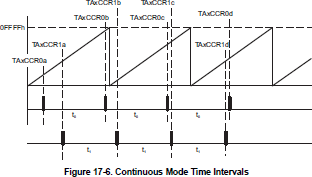 Time intervals can be produced with other modes as well, where TAxCCR0 is used as the period register. Their handling is more complex since the sum of the old TAxCCRn data and the new period can be higher than the TAxCCR0 value. When the previous TAxCCRn value plus tx is greater than the TAxCCR0 data, the TAxCCR0 value must be subtracted to obtain the correct time interval.